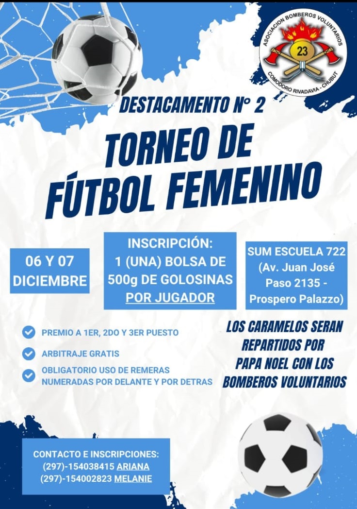 El Destacamento N° 2 de Bomberos Voluntarios organiza un torneo de fútbol femenino solidario los días 6 y 7 de diciembre en el SUM de la Escuela 722, en Av. Juan José Paso 2135, Próspero Palazzo. La inscripción es muy especial: cada jugadora debe llevar una bolsa de 500 gramos de golosinas, que serán donadas.