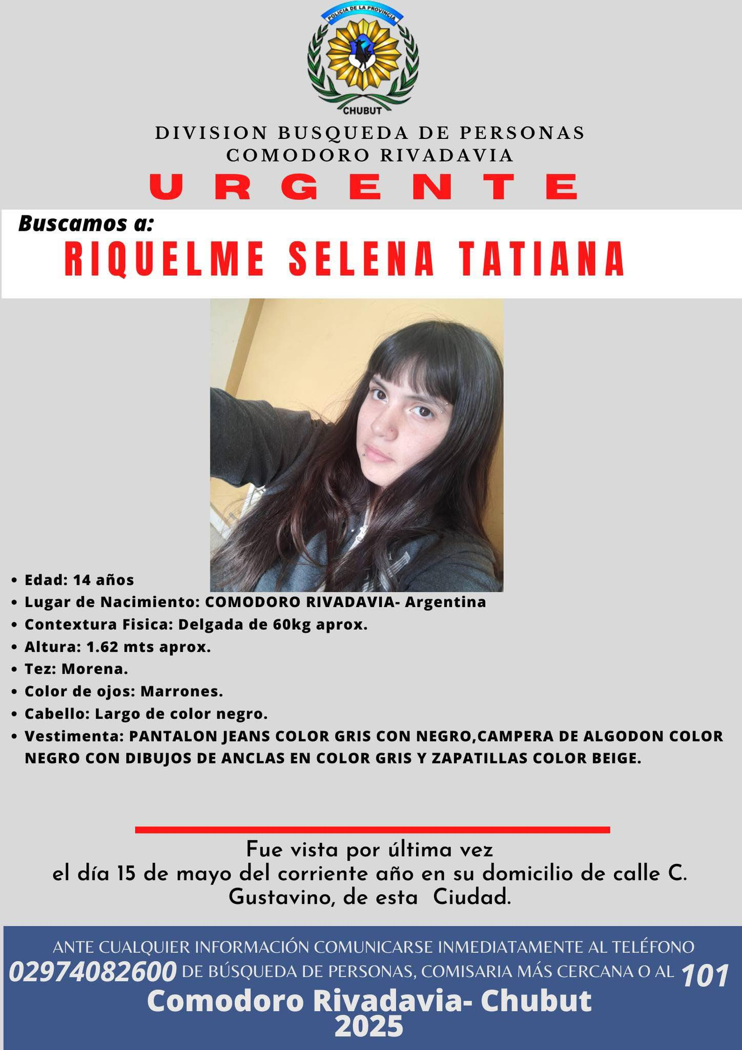 La División Búsqueda de Personas de Comodoro pide ayuda para encontrar a Selena Tatiana, una chica de 14 años que desapareció. Selena es delgada, mide 1,62 m, pesa unos 60 kg, tiene piel morena, ojos marrones y cabello largo negro.