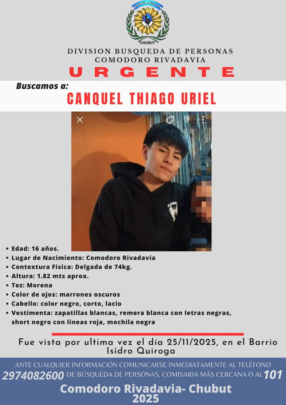 La División Búsqueda de Personas de Comodoro Rivadavia solicita la colaboración de la comunidad para dar con el paradero de Canquel Thiago Uriel, un menor de 16 años cuya desaparición fue reportada recientemente.