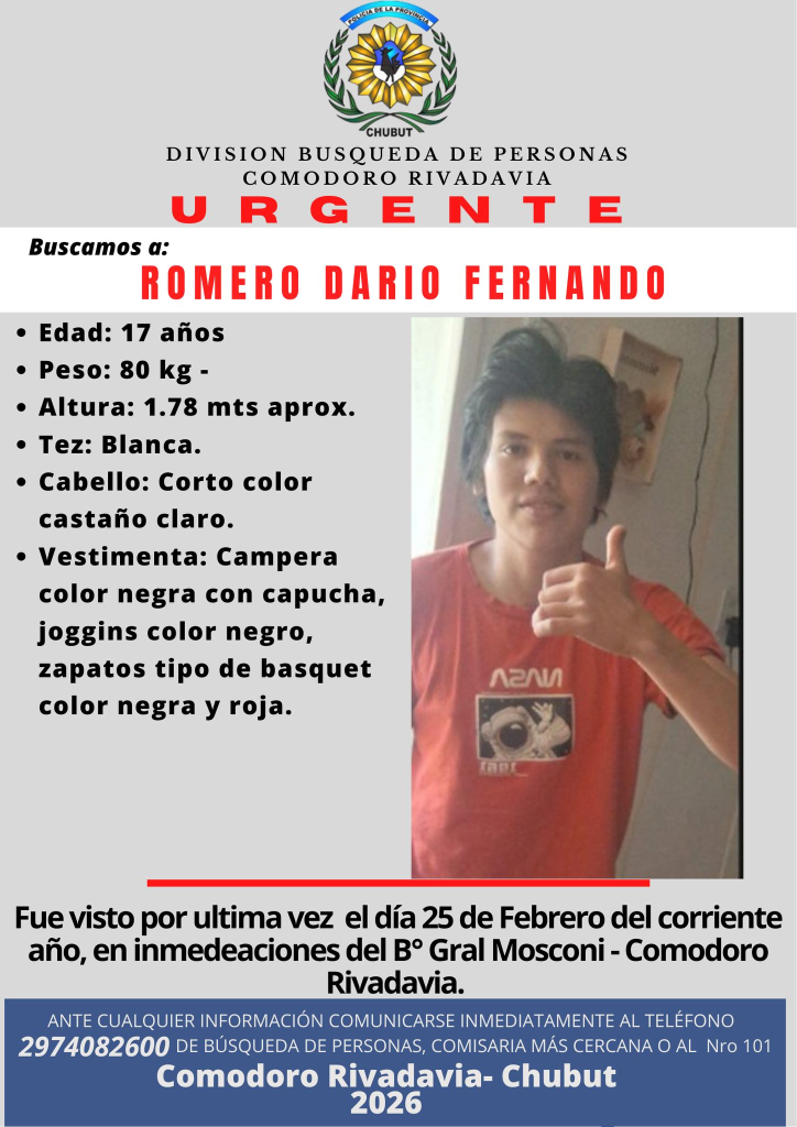 La División Búsqueda de Personas de la Policía de Chubut, en Comodoro Rivadavia, alerta por la desaparición de Dario Fernando Romero, de 17 años. Fue visto por última vez el 25 de febrero en el Barrio General Mosconi.