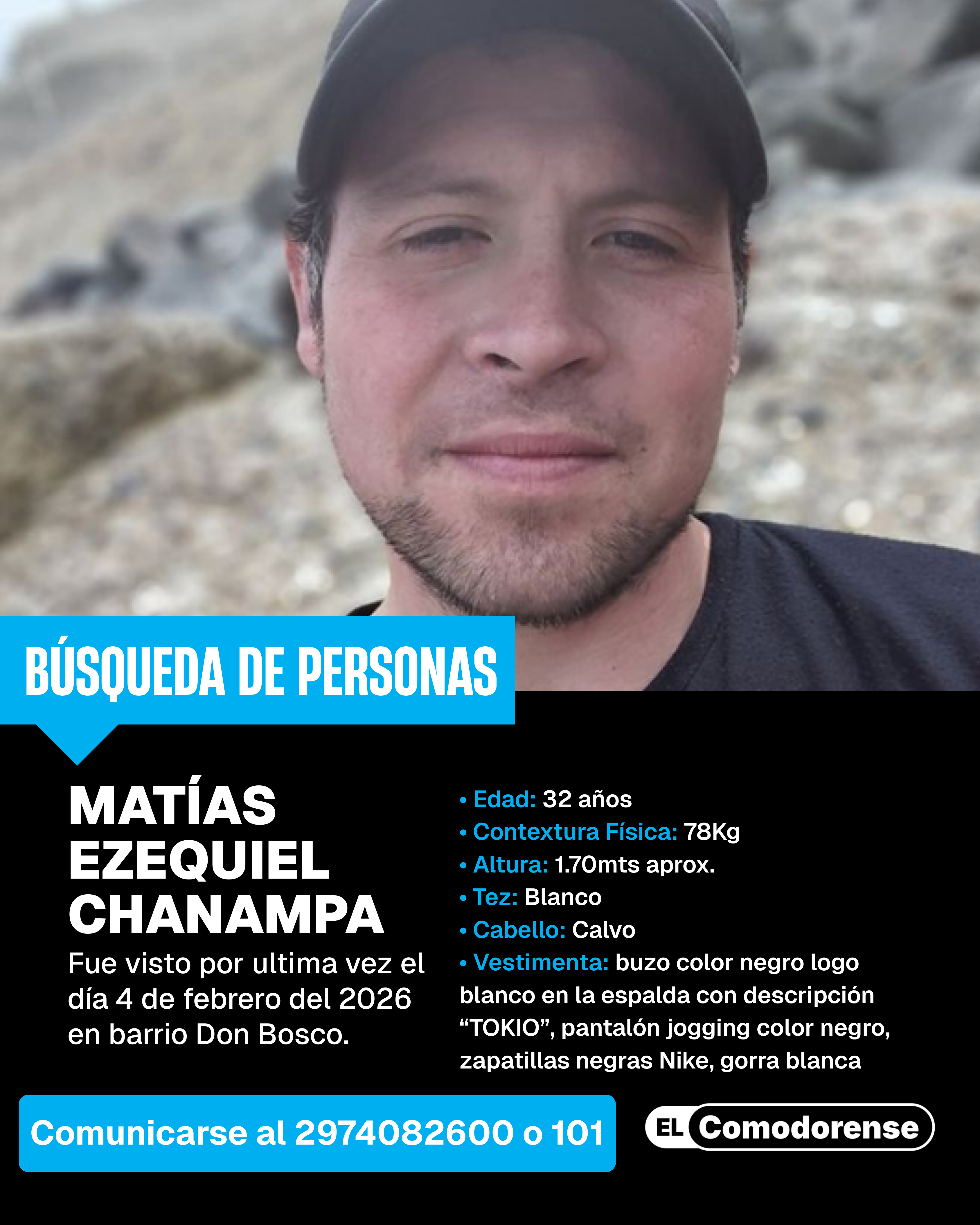 Un hombre de 32 años de nombre Matías Ezequiel Chanampa se encuentra desaparecido desde el pasado miércoles, cuando fue visto por última vez en el barrio Don Bosco, en Km8.
