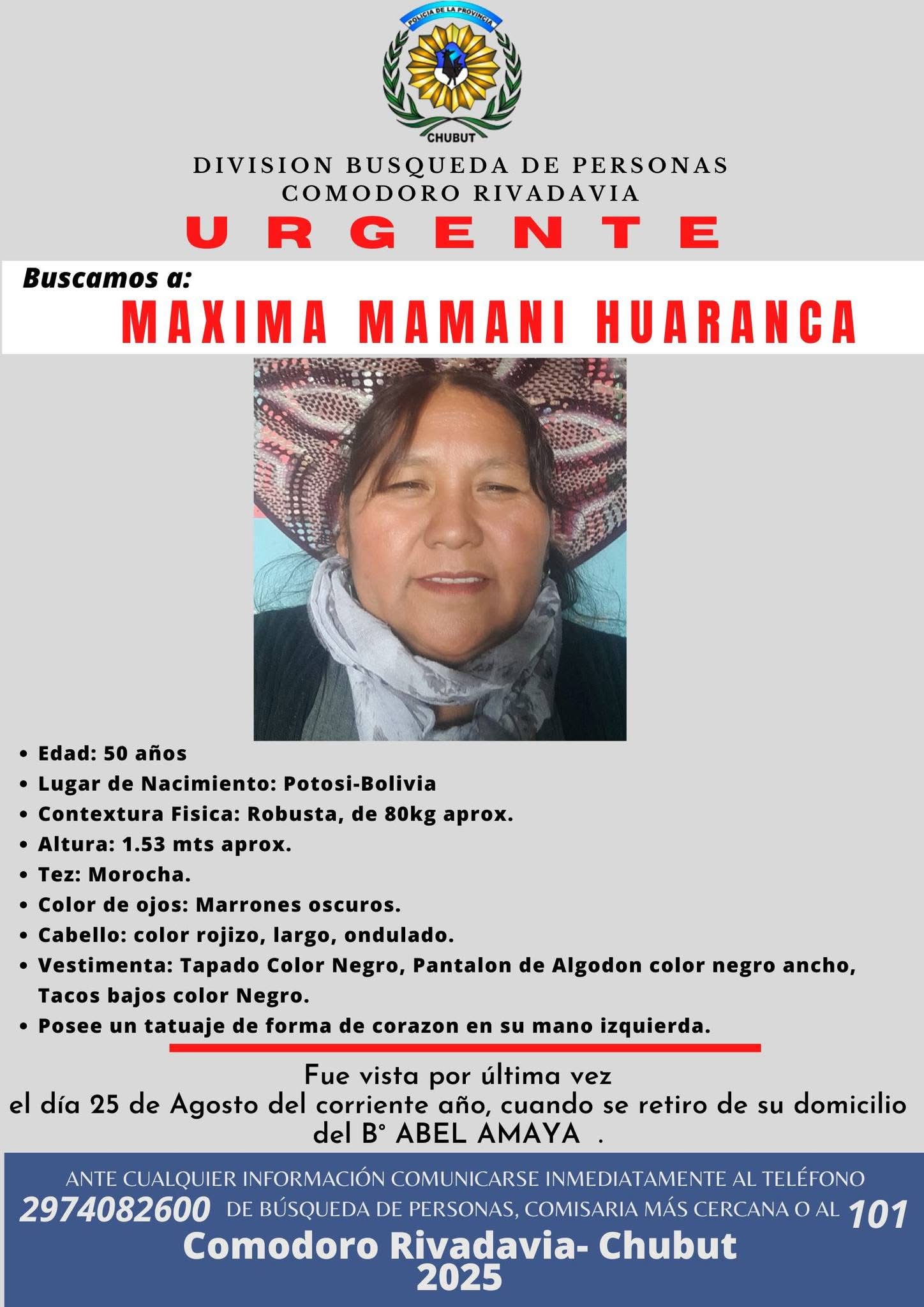 La División Búsqueda de Personas de Comodoro Rivadavia solicita la colaboración de la comunidad para dar con el paradero de Máxima Mamani Huaranca, de 50 años, quien fue vista por última vez el pasado 25 de agosto de 2025, en inmediaciones del barrio Abel Amaya.