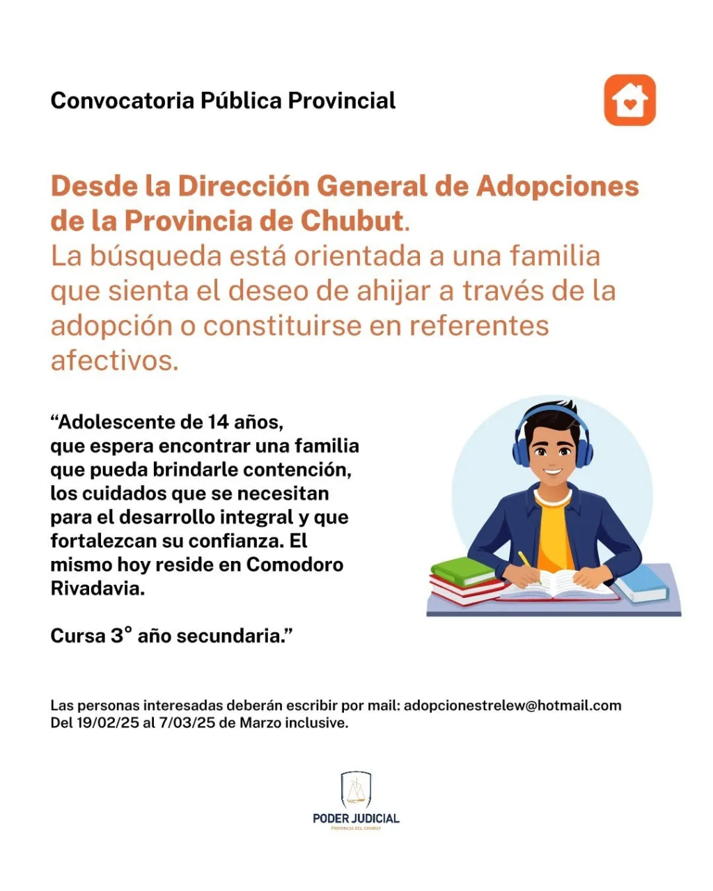 El Juzgado de Familia N° 1 de la Oficina de Gestión Unificada del Fuero de Familia de la Circunscripción Comodoro Rivadavia, a cargo de la Dra. Jorgelina Elizabeth Castillo, y en el marco del Registro Único de Aspirantes a Guardas con Fines Adoptivos de la Provincia del Chubut, convoca a personas individuales y/o familias sin configuración definidas, que deseen ofrecerse como guardadoras, tutores o figuras análogas de cuidado para un adolescente de 14 años.