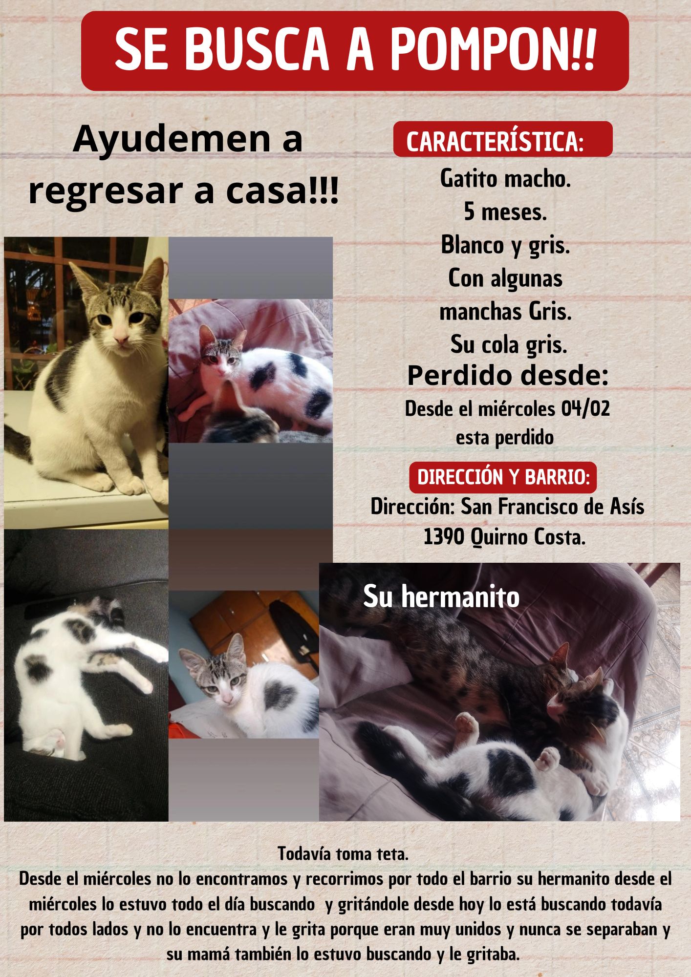 Vecinos del barrio Quirno Costa buscan intensamente a “Pompón”, un gatito macho de apenas cinco meses que se encuentra perdido desde el miércoles 4 de febrero en la zona de San Francisco de Asís al 1390.