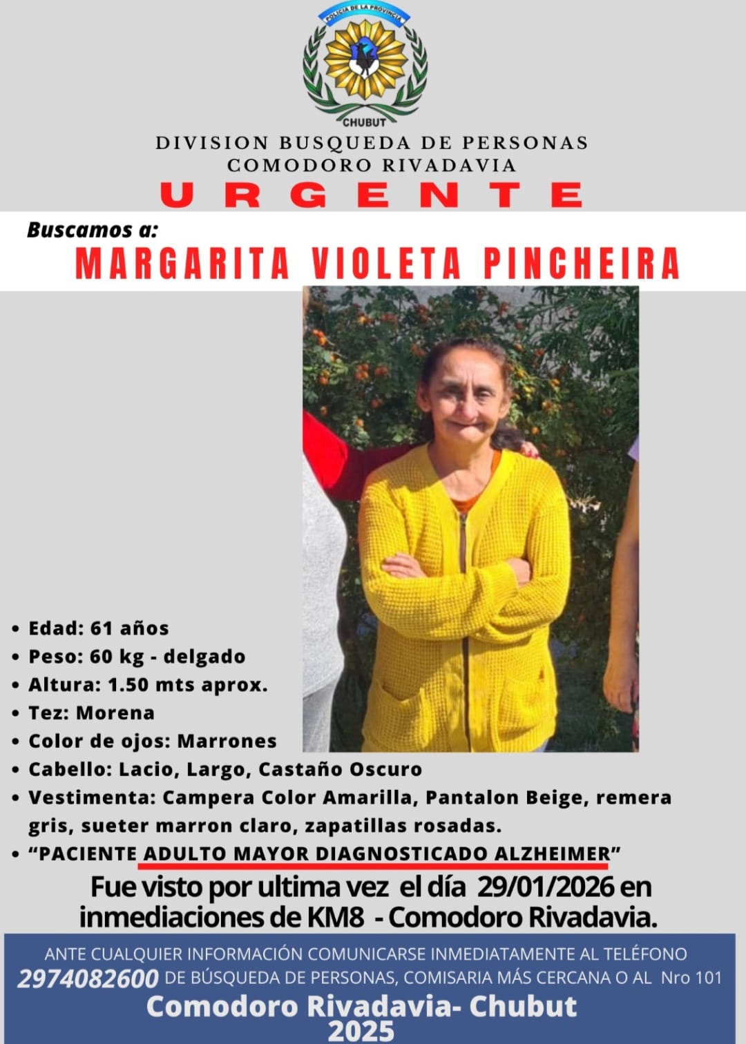 La División Búsqueda de Personas de la Policía del Chubut, con asiento en Comodoro Rivadavia, lanzó un pedido urgente de colaboración a la comunidad para dar con el paradero de Margarita Violeta Pincheira, de 61 años, quien se encuentra desaparecida desde este 29 de enero de 2026.