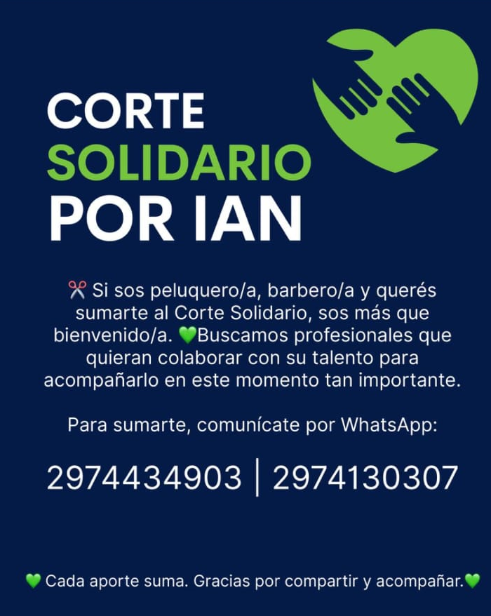 La actividad será el domingo 28 de diciembre, de 10 a 18, en Iguazú 288, Km 8. La contribución sugerida es de 8.0008.000 pesos por corte, que se destinarán a cubrir gastos de viaje y estadía de Ian y su familia en Buenos Aires.