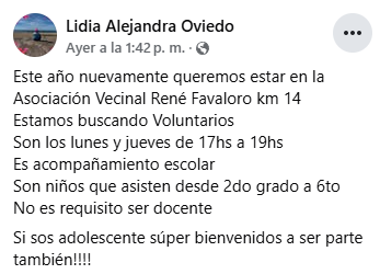 Este año, un grupo de personas comprometidas con la educación vuelve a poner en marcha las clases de apoyo escolar en la Asociación Vecinal René Favaloro, ubicada en Km 14.