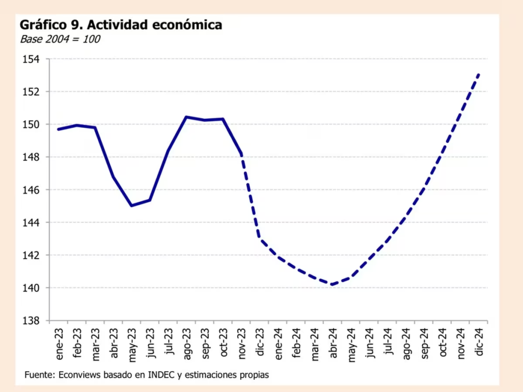 Ese pronóstico luce optimista y requiere superar, en términos políticos y de tolerancia social, el trance más duro del año caracterizado por la violenta corrección de precios relativos. Pero si eso ocurre, los economistas privados coinciden con Caputo y sus hombres: si el plan da resultados, la recuperación tendrá forma de V y ya en diciembre la actividad económica tendría el mismo nivel de antes de asumir Milei. Hacia 2025, claro, se reafirmaría la senda del crecimiento. Esa es, al menos, la proyección de Econviews, la consultora fundada por el economista Miguel Kiguel, donde prevén una recesión de 2,6% para este año algo menor a la pauta de 2,8% que publicó el FMI.