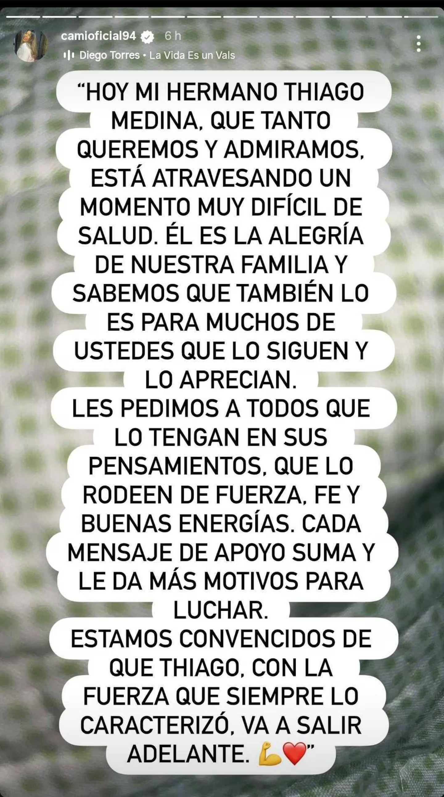 “Mi hermano Thiago, que tanto queremos y admiramos, está atravesando un momento muy difícil de salud”, escribió la exparticipante de Cuestión de peso (eltrece).