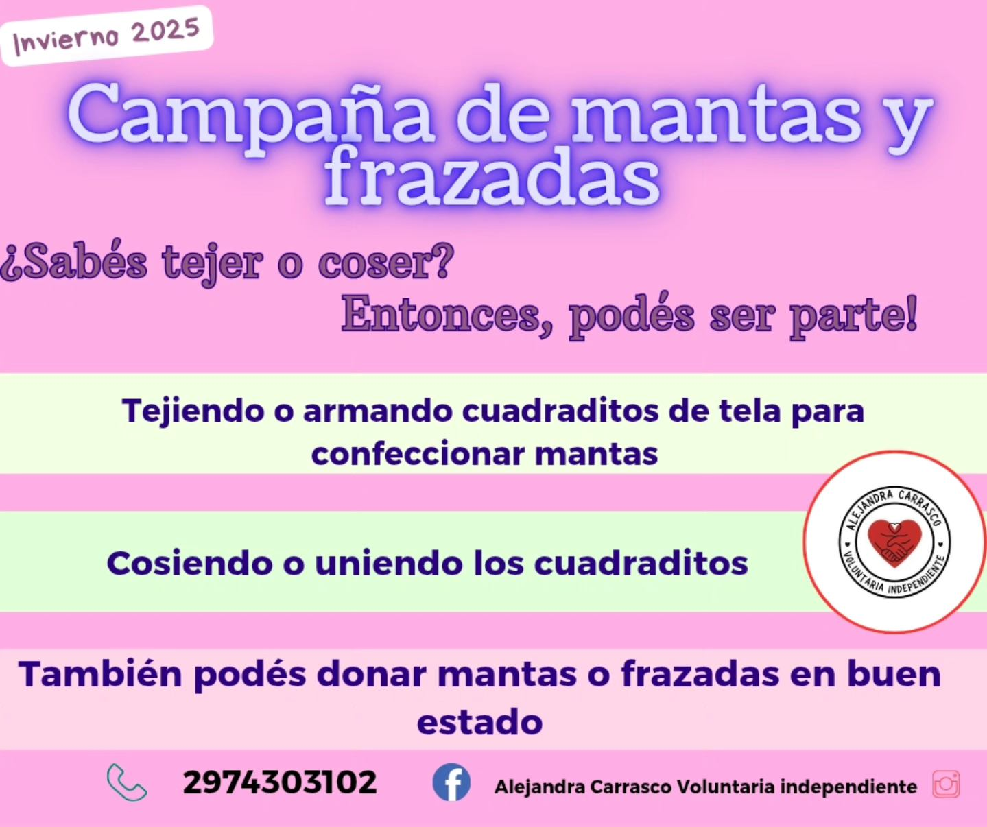 «El objetivo es entregar mantas y frazadas a las familias de distintos merenderos de la ciudad. Podes armar cuadraditos tejidos, o cuadros de tela a partir de ropa que ya no sirve. Si te animas, armas una manta entera. Sino, retiraré los cuadrados para dárselos a quienes se ofrezcan a coser o unirlos», explicó sobre la propuesta.