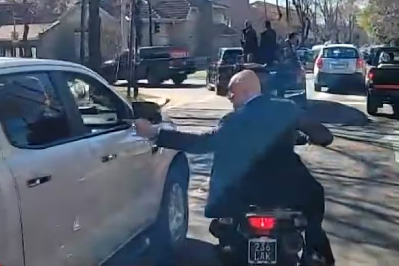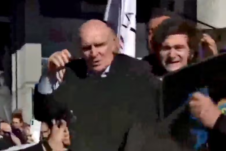 Cuando la camioneta en la que iba Milei junto con su hermana Karina, el candidato José Luis Espert y el armador Sebastián Pareja, pasaba por el centro del municipio, en la avenida Hipólito Yrigoyen y Laprida, empezaron a volar algunos objetos contra el Presidente.