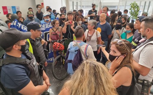 En Comodoro Rivadavia, y al grito de ‘No es No’, desplazaron a los uniformados en una de las entradas al edificio, marco en el cual estalló una de las puertas vidriadas.