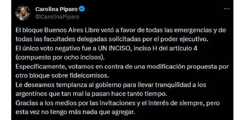 “El bloque Buenos Aires Libre votó a favor de todas las emergencias y de todas las facultades delegadas solicitadas por el poder ejecutivo. El único voto negativo fue a UN INCISO, inciso H del artículo 4 (compuesto por ocho incisos)”, comenzó escribiendo la diputada nacional en su cuenta de X. Y especificó: “Votamos en contra de una modificación propuesta por otro bloque sobre fideicomisos”.