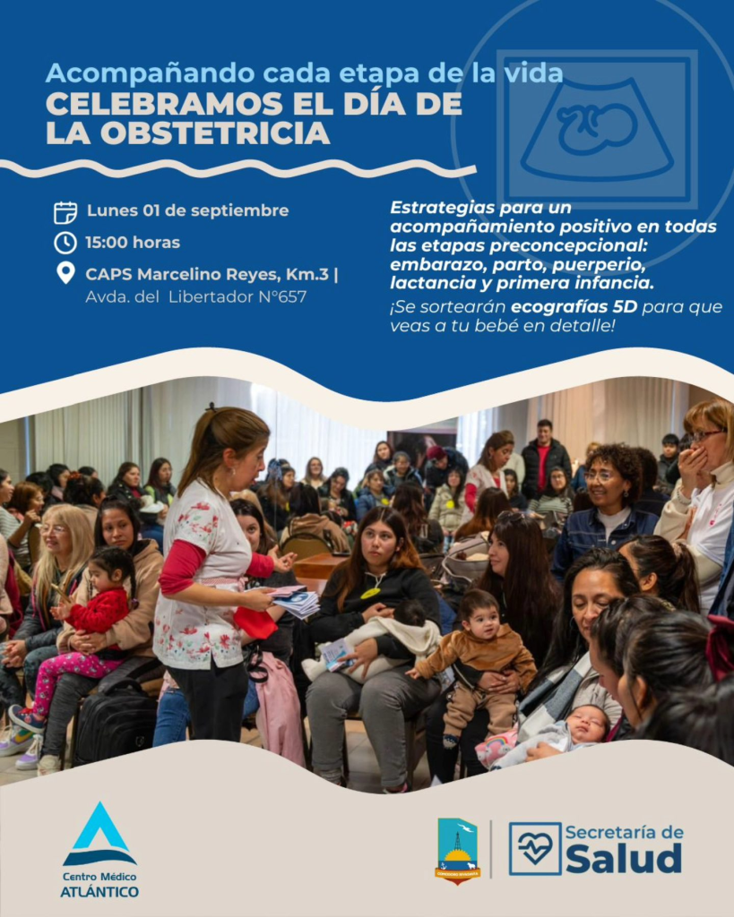 La Secretaría de Salud, junto al Centro Médico Atlántico, invita a la comunidad a participar de la jornada por el Día de la Obstetricia, que se realizará el próximo lunes 1 de septiembre a las 15 horas en el CAPS Marcelino Reyes (Km.3, Av. del Libertador N°657).