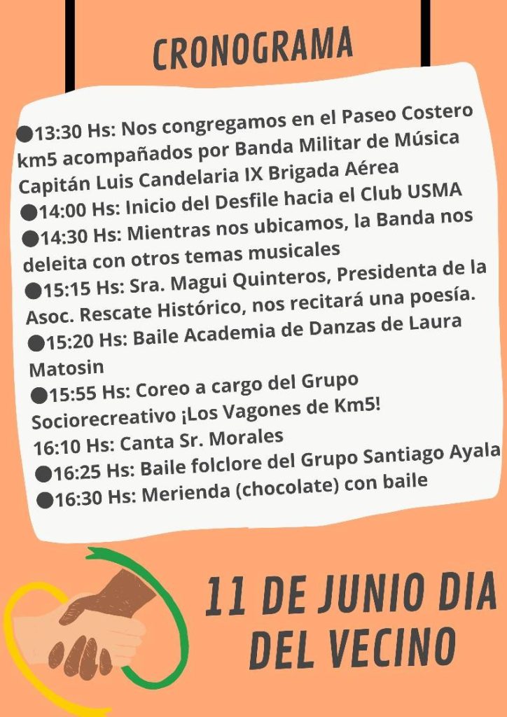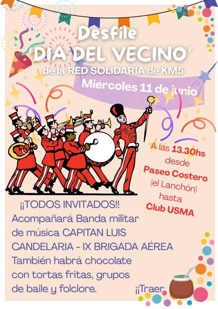 Este miércoles 11 de junio, se realizará una jornada festiva en el marco del Día del Vecino, organizada por la Red Solidaria de Km5. La celebración contará con un desfile comunitario, espectáculos y una merienda compartida.