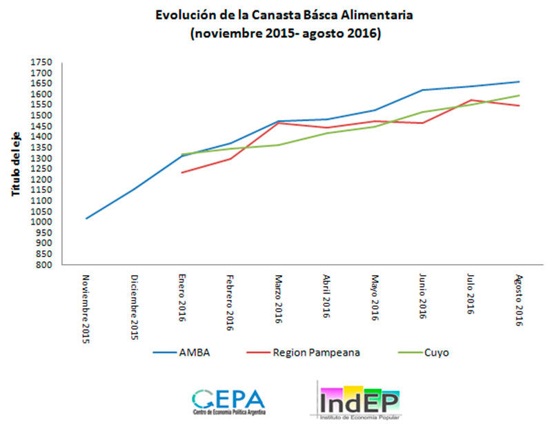 En este sentido, si en noviembre de 2015 el valor de la Canasta Básica ascendía a $1 .020, dicho valor se eleva bruscamente a $1.312 en enero (29% de aumento), para luego alcanzar $1.622 en junio (59% de aumento) para el adulto equivalente. Vale remarcar que la evolución de la canasta medida por CEPA es coincidente con la publicada por INDEC que en junio de 2016 estimó para el AMBA la canasta en $1.614.