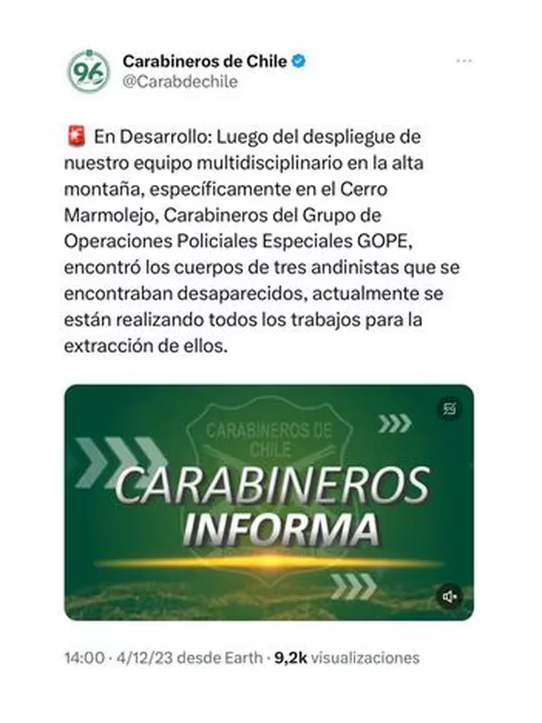 Se desconocía en ese entonces en qué condiciones de salud se encontraban, pero las expectativas no eran buenas. El posteo de Carabineros confirmó las sospechas luego de que a la zona llegó el personal de GOPE para ir en busca de los tres argentinos.