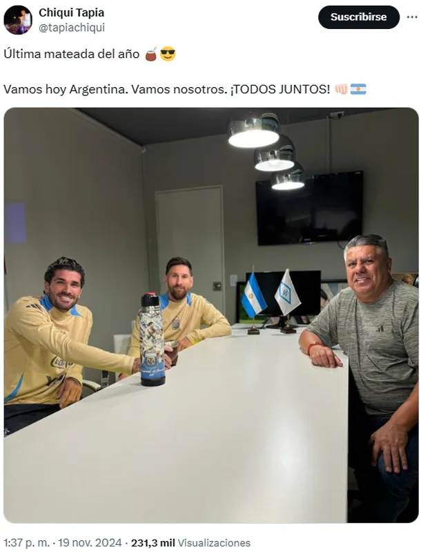 Como cada vez que el equipo argentino juega de local, Claudio «Chiqui» Tapia compartió su habitual foto con Messi y Rodrigo De Paul, tomando mates en la oficina del dirigente. «Última mateada del año. Vamos hoy Argentina. Vamos nosotros. ¡TODOS JUNTOS!», escribió el presidente de la Asociación del Fútbol Argentino (AFA), con emojis alentando su mensaje.