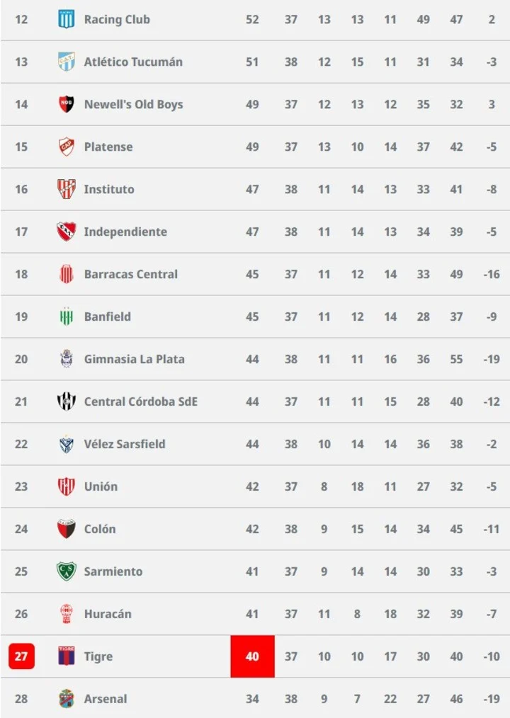 Arsenal (34), descendido por los promedios, es el último en la tabla anual. Luego se ubican Tigre (40), Huracán y Sarmiento (41), Colón y Unión (42), Vélez, Central Córdoba y Gimnasia (44), Barracas Central y Banfield (45), Independiente (47) e Instituto (47).
