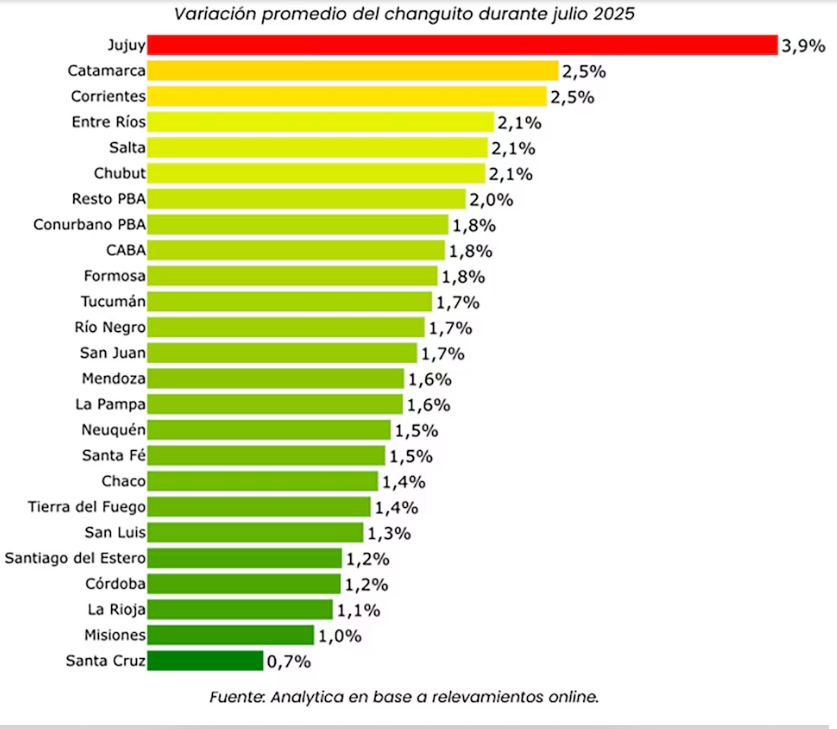 En cuanto a la variación mensual, Jujuy registró el mayor incremento con 3,9%, mientras que Catamarca y Corrientes subieron 2,5%. En términos absolutos, Catamarca lideró con $34.000 adicionales en un mes, seguida por Corrientes ($29.927), Jujuy ($28.213) y La Rioja ($23.139). La Patagonia presentó incrementos más moderados: Tierra del Fuego (+$8.631) y Santa Cruz (+$4.997). Misiones mostró un aumento más contenido, de apenas 1%, similar al de Santa Cruz (+0,7%).