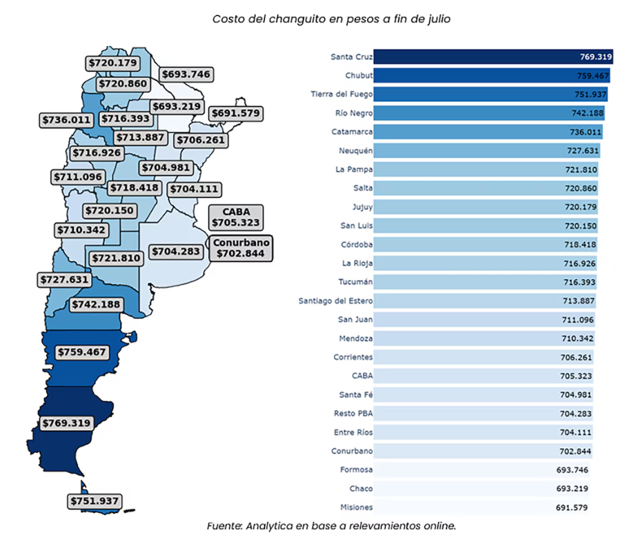 En el otro extremo, las provincias del Noreste argentino ofrecen los precios más accesibles: Formosa ($693.746), Chaco ($693.219) y Misiones ($691.579). La diferencia entre Santa Cruz y Misiones supera los $75.000, evidenciando una notable brecha en el acceso a los mismos productos según la región.