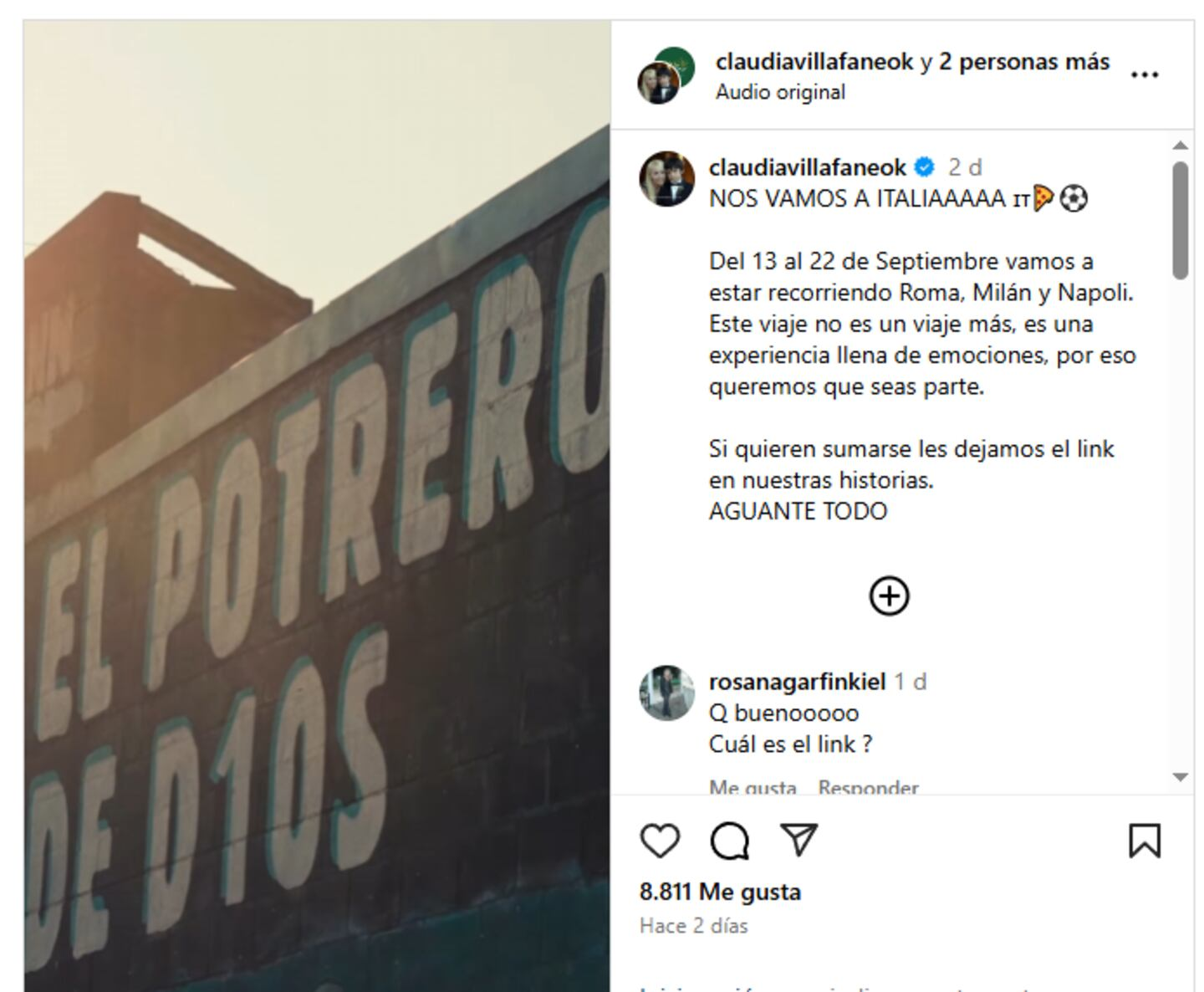 “No es un viaje más, es una experiencia llena de emociones y por eso queremos que seas parte”, fue la frase con la que Claudia promocionó en sus redes este tour para visitar lugares en los que estuvo Maradona.