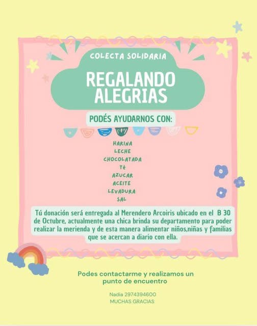 Una nueva iniciativa solidaria busca acompañar a las familias del barrio 30 de Octubre. Bajo el nombre “Regalando Alegrías”, se está llevando adelante una colecta para reunir alimentos que serán destinados al Merendero Arcoíris, donde a diario se brinda una merienda a niños, niñas y familias de la zona.