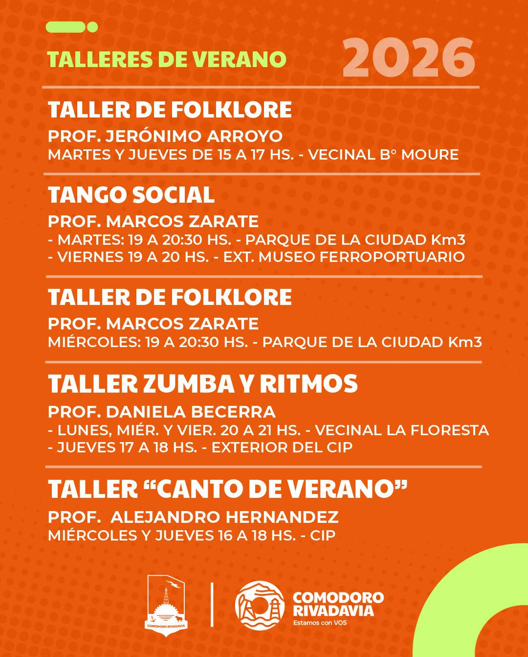 Entre las propuestas se destacan los talleres de Folklore, a cargo de los profesores Jerónimo Arroyo y Marcos Zárate, que se dictan en la Vecinal del barrio Moure y en el Parque de la Ciudad del Km 3. También se ofrece Tango Social, con clases en el Parque de la Ciudad y en el exterior del Museo Ferroportuario.