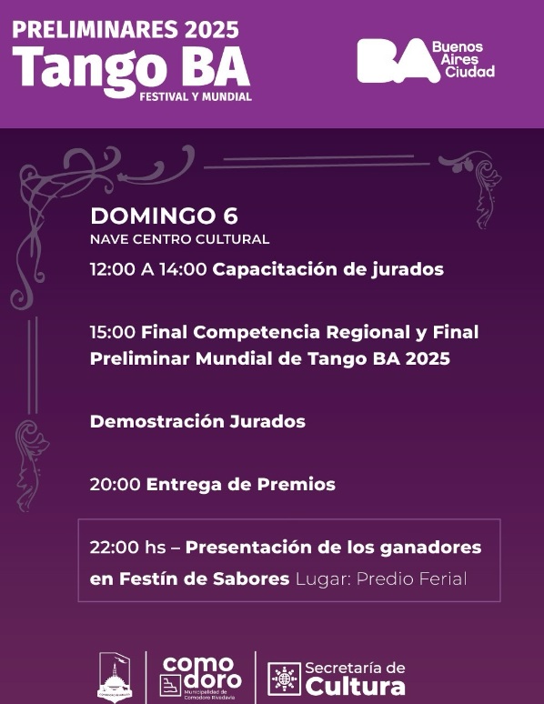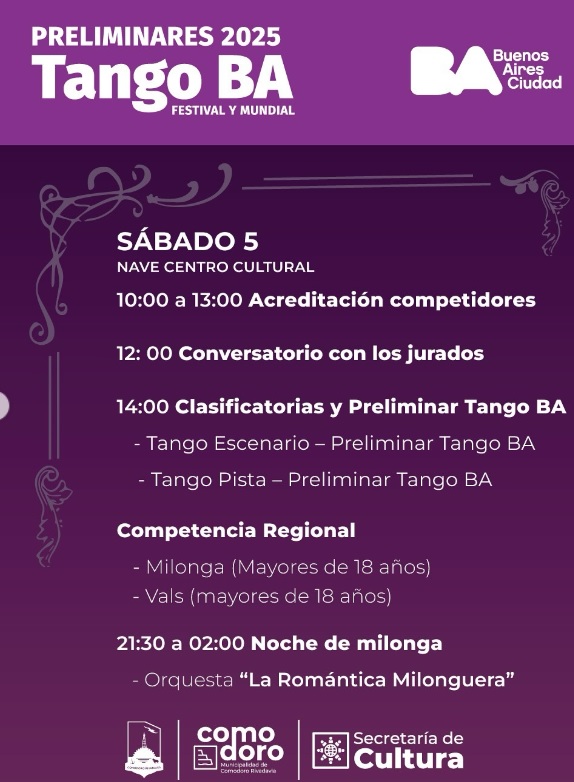 La ciudad tendrá la llegada del Preliminar de Tango BA 2025, uno de los eventos para los amantes del tango. Durante el 4, 5 y 6 de abril, el Centro Cultural Comodoro será el epicentro de esta competencia que reúne a las mejores parejas de tango de la región, así como a los fanáticos de este género musical y del baile.