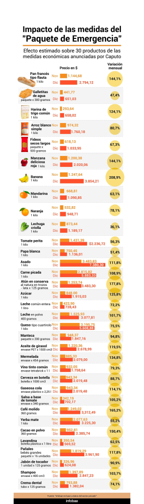 El relevamiento se focalizaba sobre 30 precios de la canasta básica y de consumo masivo, primeras marcas. Y las primeras aproximaciones arrojaban un promedio de subas del 98,7% para esos bienes. Precios que se duplicarían, en el muy corto plazo.