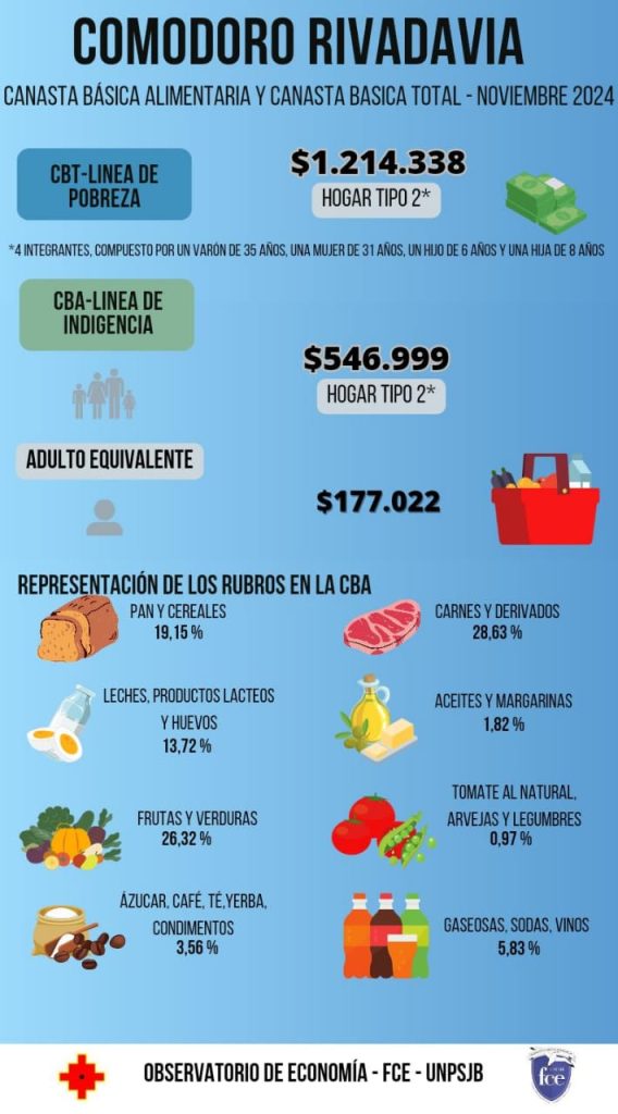 El Observatorio de Economía de la FCE, compartió el informe del costo de la Canasta Básica Alimentaria (CBA) y la Canasta Básica Total (CBT) en las principales ciudades de la provincia, correspondiente al mes de noviembre 2024.