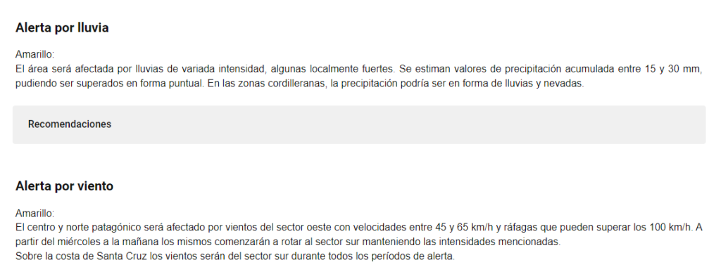 Se esperan eventos climáticos fuertes en Comodoro, primero con viento del sudoeste hasta en 90km/h que abarcaría desde la medianoche hasta la tarde-noche, desatando una alerta amarilla.