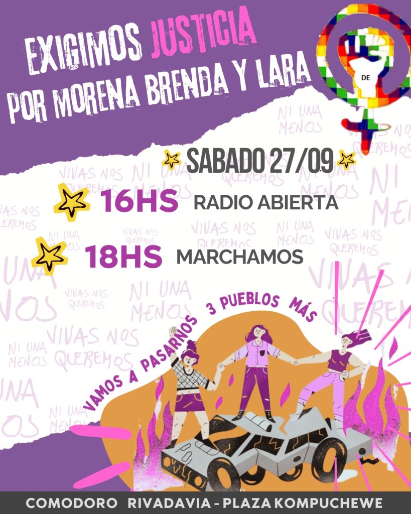 La concentración será este sábado 27 de septiembre en la Plaza Kompuchéwe. A las 16 horas se realizará una radio abierta y desde las 18 horas se llevará a cabo una movilización bajo la consigna “Exigimos justicia por Morena, Brenda y Lara”.