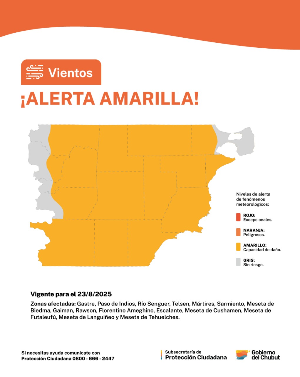 La Subsecretaría de Protección Ciudadana, dependiente del Ministerio de Seguridad y Justicia, informó una actualización en la cobertura del alerta amarilla por vientos emitida por el Servicio Meteorológico Nacional. La alerta está vigente desde la mañana hasta la noche del sábado 23 de agosto y se reactivará durante la mañana y tarde del domingo 24.