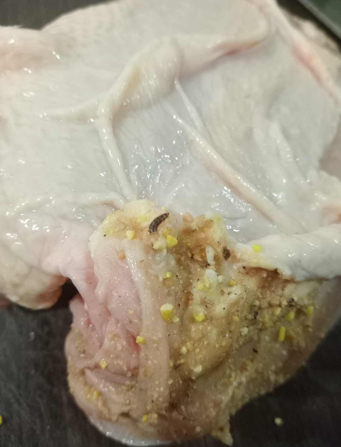Cuando revisó el pollo que había comprado, encontró que una parte estaba sumamente podrida e incluso con gusanos.