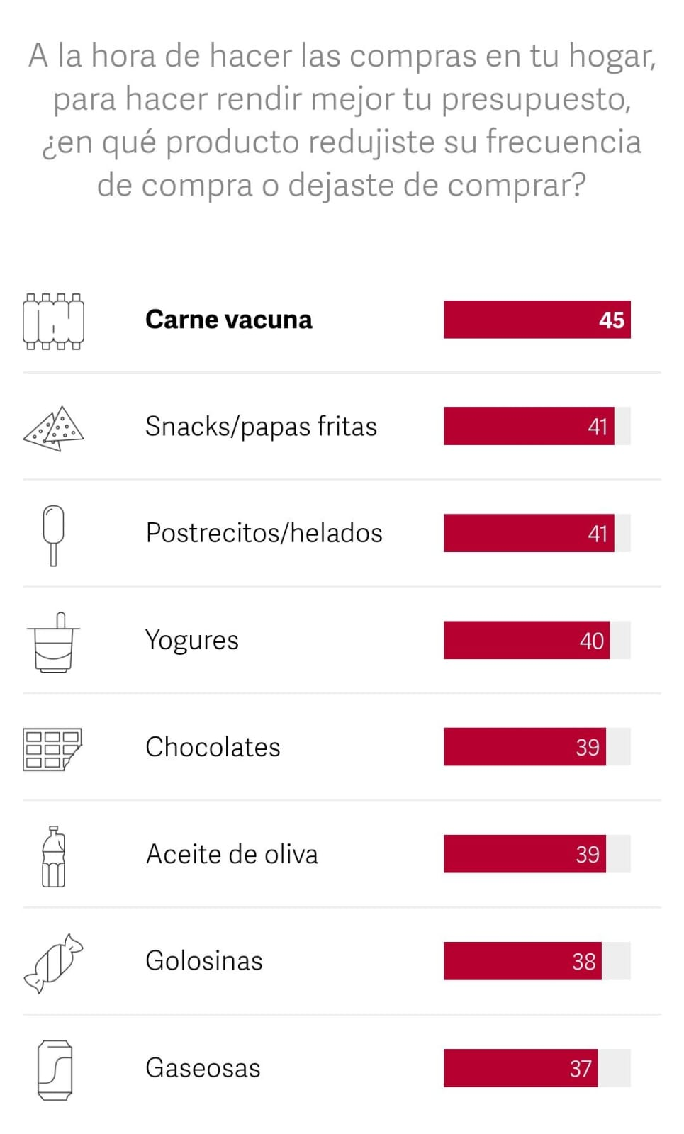 ¿Qué productos o categorías de consumo masivo retrocedieron más? Según el relevamiento de la consultora Moiguer, carne vacuna (45% de las menciones) snacks, papas fritas (41%), postrecitos/helados (41%), yogures (40%) chocolates (39%), aceite de oliva (39%), golosinas (38%) y gaseosas (37%).
