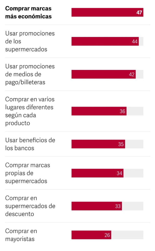 Según el estudio de Moiguer, surgieron nuevas estrategias y hábitos, entre ellas comprar marcas más baratas (47%) usar promociones de los supermercados (44%), usar promociones de medios de pago y de billeteras virtuales (42%), comprar en diferentes lugares según el producto (36%), usar beneficios de los bancos (35%), comprar marcas propias de los supermercados (34%), comprar en supermercados de descuentos (como Día) (33%), comprar en mayoristas (26%).