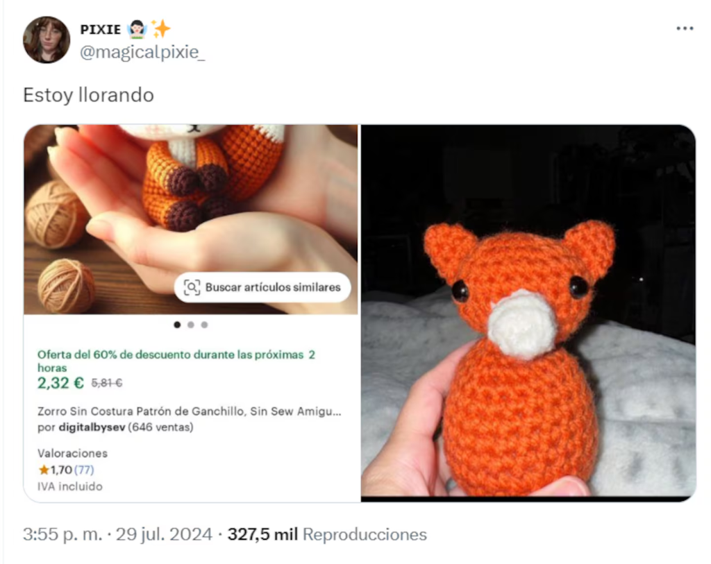 En la publicación de venta se ve una hermosa foto de un zorro tejido al crochet con increíbles detalles tanto en sus patas como en su hocico, ojos y orejas. Su precio era tentador, ya que tenía una rebaja del 60% y el precio final quedaba en 2,32 euros.