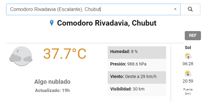 Sobre las 19h, el Servicio Meteorológico Nacional marca que Comodoro tiene una temperatura de 37,7 grados.