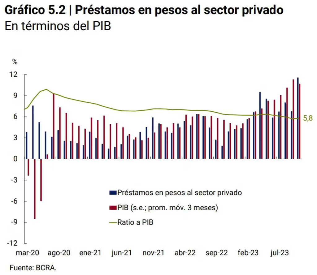 “Los préstamos en pesos al sector privado en términos reales y sin estacionalidad habrían registrado una expansión luego de dos meses de contracciones. Así, en octubre habrían exhibido un crecimiento a precios constantes de 1,3% s.e. (sin estacionalidad) y en los últimos 12 meses acumularían una caída en torno a 13%”, indicó el organismo en su informe monetario mensual.