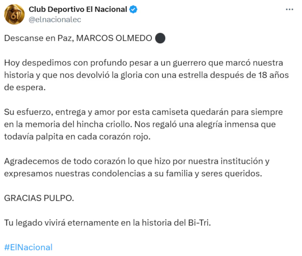 El Nacional, club en el que Olmedo jugó en 2024 y con el que conquistó la Copa Ecuador, le dedicó un emotivo mensaje de despedida.