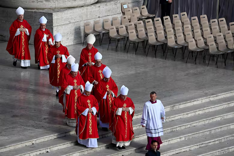 Aunque el Papa había querido una ceremonia simplificada -en lugar de tres ataúdes (de zinc, roble y ciprés), quiso sólo uno de sencilla madera-, el funeral de todos modos siguió precisos ritos milenarios. Y resultó tan solemne como el de sus predecesores, con una imponente presencia de presidentes, jefes de Estado y de gobierno, cabezas coronadas, líderes religiosos de diversos credos, 220 cardenales -entre los cuales probablemente está su sucesor- y 750 entre obispos y sacerdotes -entre ellos, muchos argentinos, liderados por el arzobispo de Mendoza, Marcelo Colombo, presidente de la Conferencia Episcopal Argentina-. Todo comenzó con una procesión de “sediari” que, con guantes blancos, entre aplausos, llevaron al hombro su féretro hasta el sagrato de la Plaza de San Pedro minutos antes de las diez de la mañana. El libro de los Evangelios, abierto, fue colocado sobre el ataúd por el ceremoniero vaticano. Y los cardenales que en procesión llegaron desde la Basílica se inclinaron ante él, en medio de bellísimo coros de la Capilla Sixtina.