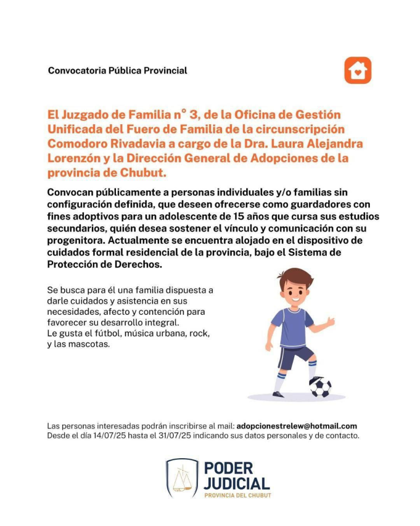 Laura Alejandra Lorenzón, junto a la Dirección General de Adopciones de la provincia del Chubut, convocan públicamente a personas individuales o familias que deseen postularse como guardadores con fines adoptivos para un adolescente de 15 años.