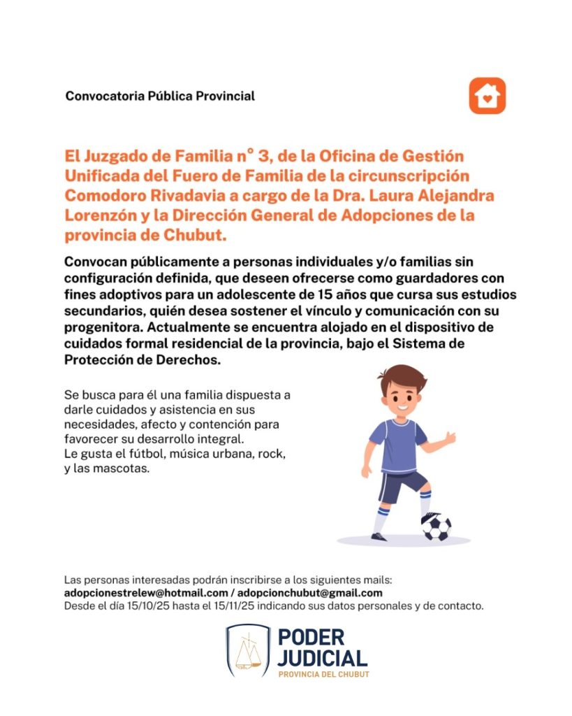 El Juzgado de Familia N° 3 de Comodoro Rivadavia, a cargo de la Dra. Laura Alejandra Lorenzón, junto con la Dirección General de Adopciones de la provincia del Chubut, lanzó una convocatoria pública provincial para personas o familias que deseen ofrecerse como guardadores con fines adoptivos para un adolescente de 15 años.