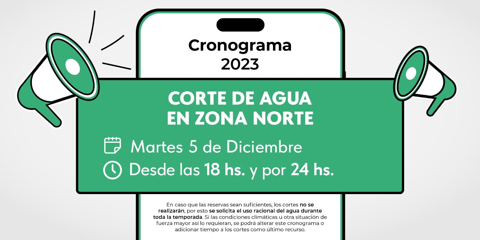 Asimismo, recuerda que mañana miércoles 06 desde las 18 y por 24 horas en zona Sur y Central, se hará lo mismo con el objetivo de recuperar las reservas del Puesto La Mata.