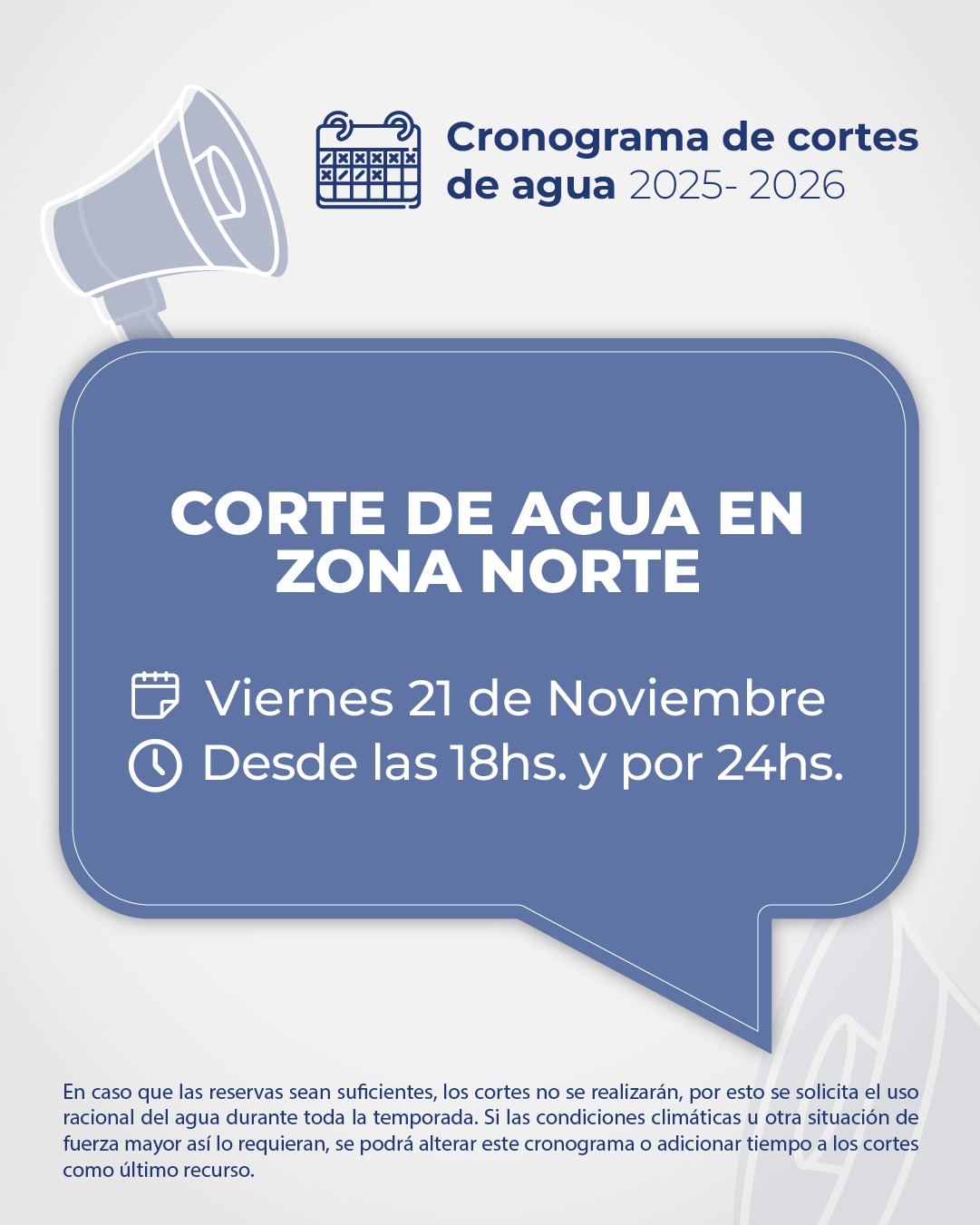 La SCPL informó que hoy viernes 21 de noviembre, desde las 18hs. y por un lapso de 24hs., se interrumpirá el suministro de agua en Zona Norte.