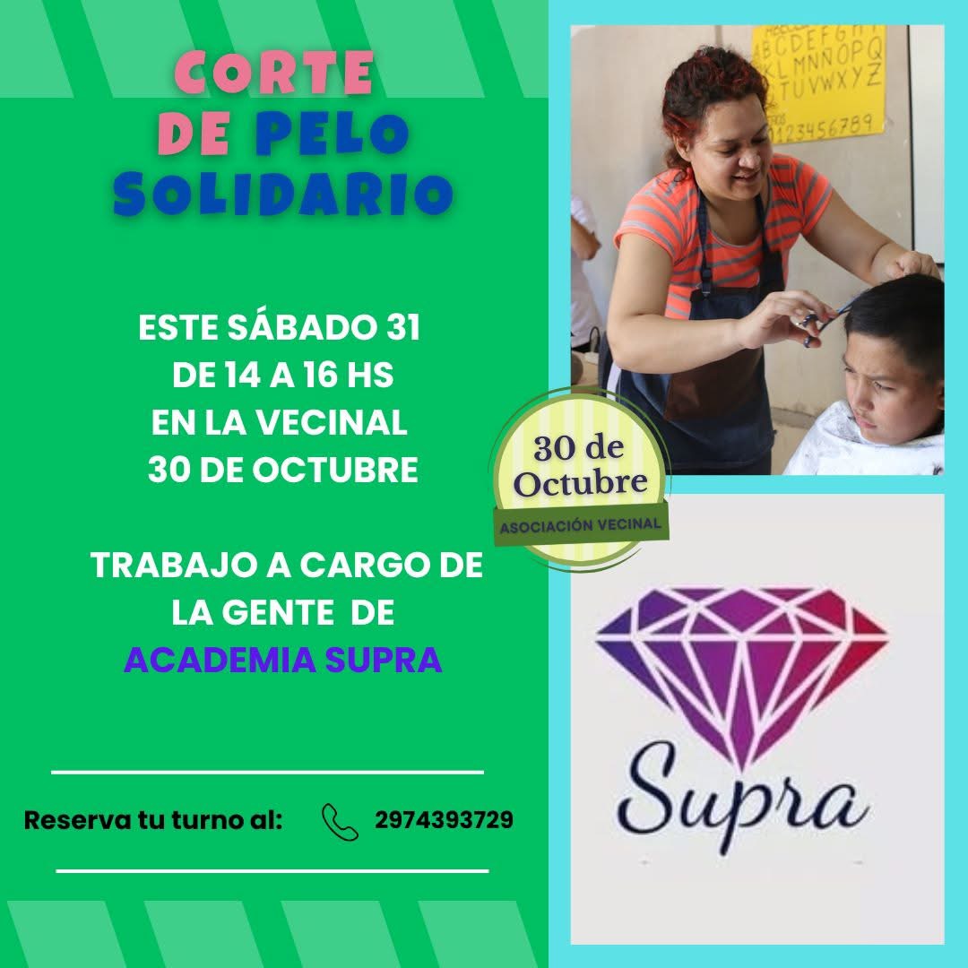 Este sábado 31 se llevará a cabo una jornada de corte de pelo solidario en la sede de la Asociación Vecinal 30 de Octubre, de 14 a 16 horas. La actividad es gratuita y está destinada a vecinos y vecinas del barrio, con el objetivo de brindar un servicio accesible y solidario.