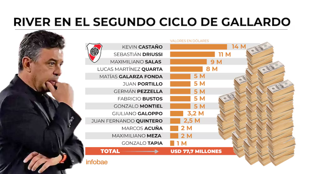 En total, el segundo ciclo de Gallardo tuvo un desembolso del Millonario cercano a los 78 millones de dólares según las cifras estimativas del sitio especializado Transfermarket con Castaño (14 millones), Driussi (11 millones), Salas (9 millones) y Martínez Quarta (8 millones) como los apellidos que más costo significaron para las arcas del club. Galarza, Portillo, Pezzella, Bustos y Montiel obligaron a invertir unos cinco millones de dólares por cada uno, pero además River pagó por los arribos de Quinteros (2.5 millones), Acuña (2 millones), Meza (2 millones) y Tapia (1 millón). El caso de Galoppo suma una particularidad: llegó a préstamo con una obligación de compra por 3.2 millones de dólares que seguramente será ejecutada.