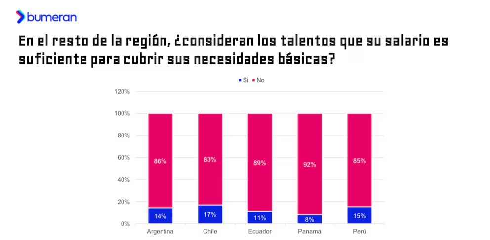 Así surge de un informe de Bumeran que también relevó la situación salarial en el resto de los países de la región. En Panamá, el 92% de los trabajadores declara que su ingreso no cubre lo esencial; en Ecuador, el 89%; en Perú, el 84%; y en Chile, el 83%.