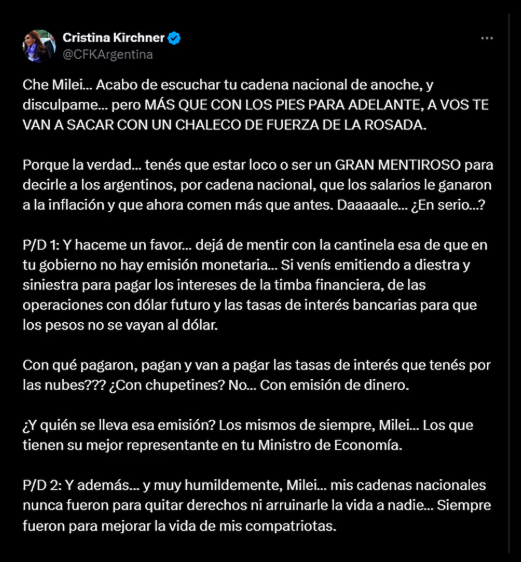 La tensión política entre Cristina Fernández de Kirchner y Javier Milei sumó un nuevo capítulo explosivo. Tras la cadena nacional del Presidente, en la que defendió su política fiscal y anunció un proyecto para sancionar presupuestos con déficit, la exmandataria salió al cruce con un mensaje directo y filoso: “Che Milei… más que con los pies para adelante, a vos te van a sacar con un chaleco de fuerza de la Rosada”.